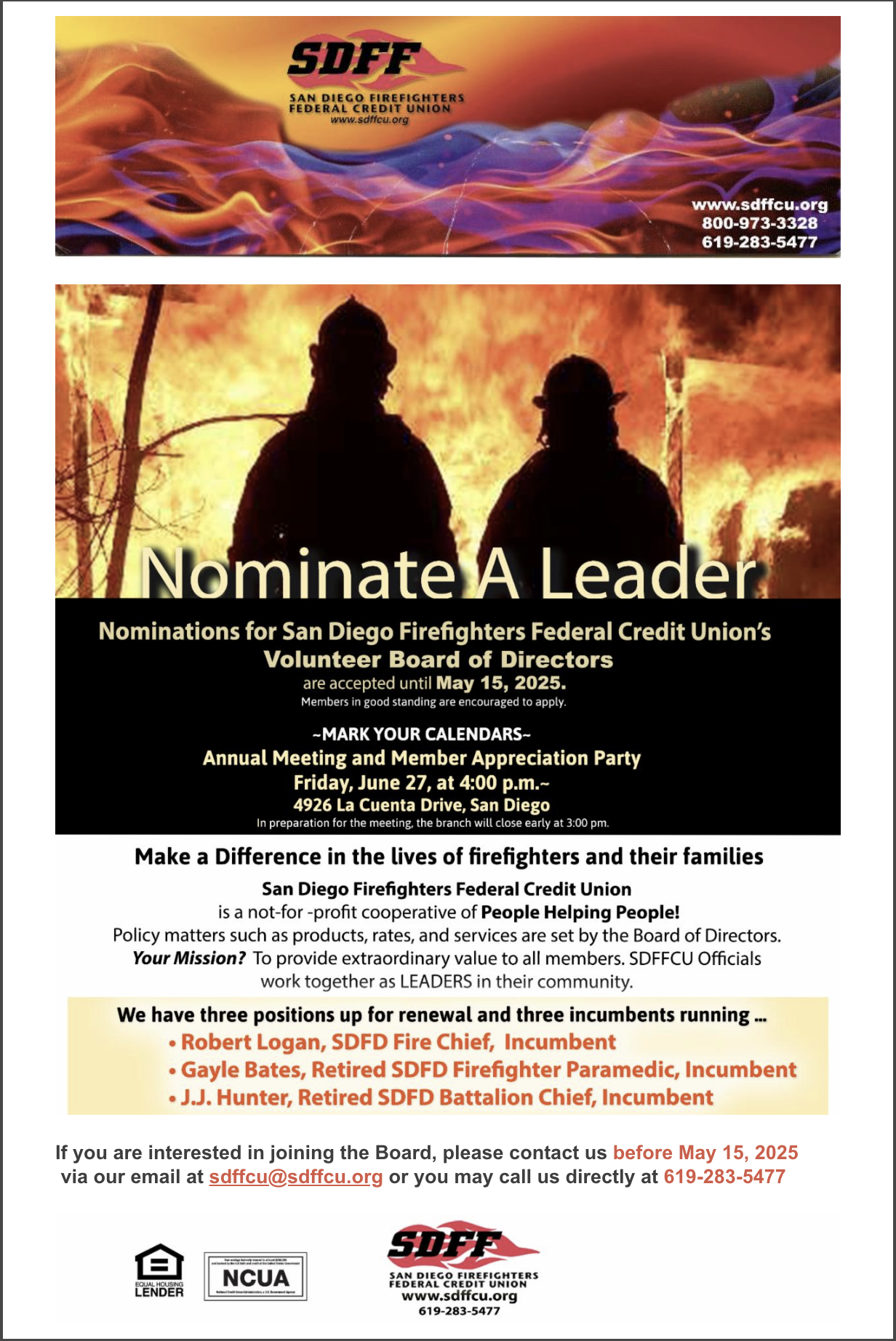 Nominations for San Diego Firefighters Federal Credit Union's Volunteer Board of Directors are accepted until May 15, 2025.